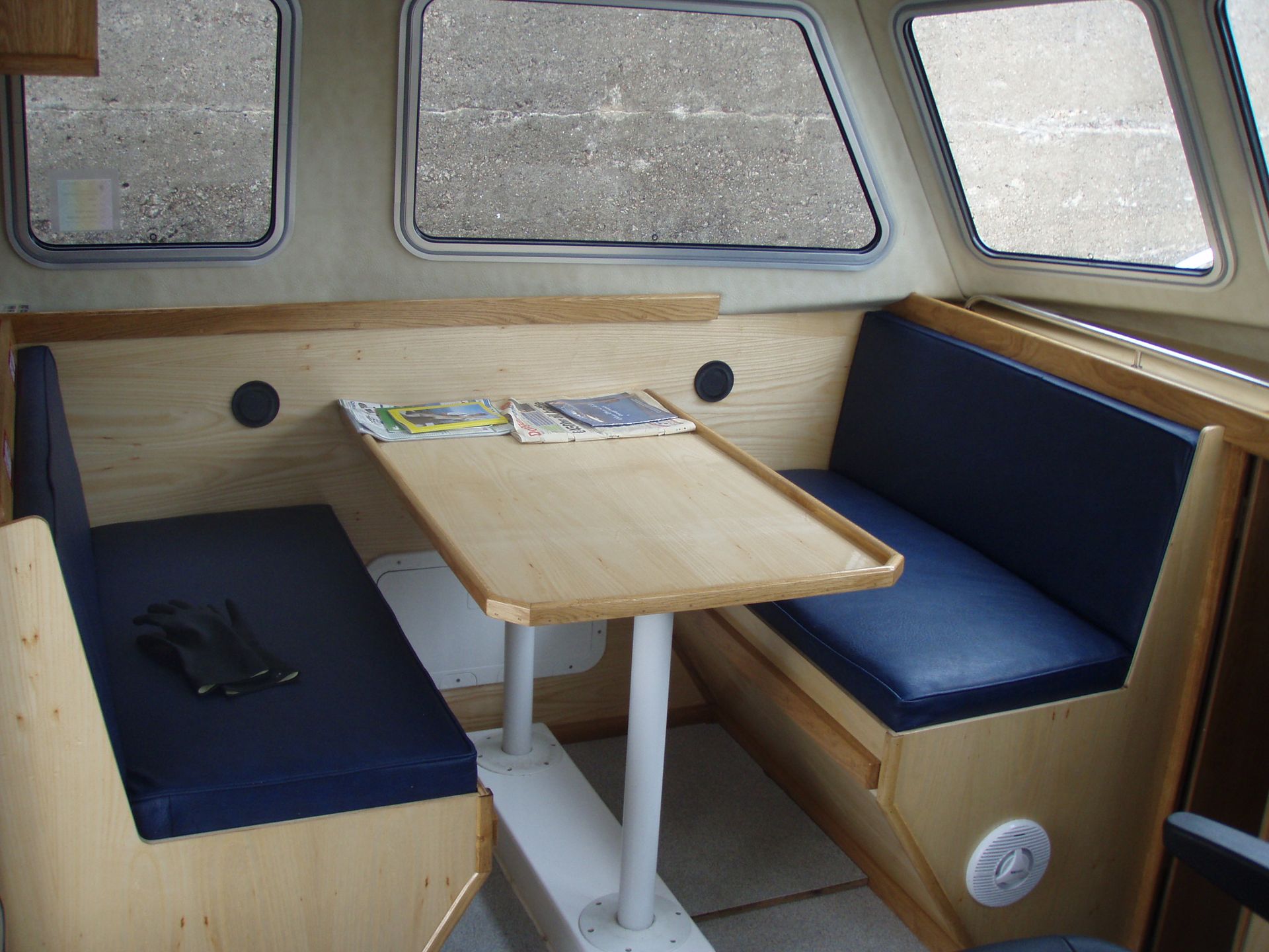 The heated cabin has comfortable seating for 4 at a table and the galley is equipped with a Hot Water Boiler for hot drinks and a microwave oven and sink.